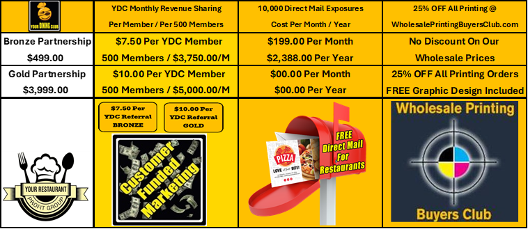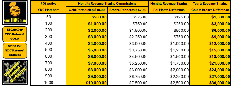 Earn $7.50 (Bronze) Or $10.00 (Gold) From The $19.95 Per Month Your Dining Club Member Subscription By Simply Sharing Your Dining Club With Your Customers Using Our FREE YDC Marketing Postcards. Monthly Revenue Sharing Commission Payments Start Immediately with NO CAP ON HOW MUCH MONTHLY REVENUE SHARING YOU CAN EARN. Revenue Sharing is optional, and no restaurant is required to participate in this part of the Your Dining Club Restaurant Partnership.